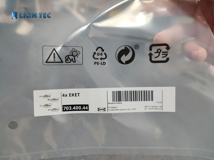這是宜家家居通過藍(lán)茵UV噴碼機在PE塑料包裝袋圖案標(biāo)識、條碼、文本、logo的高清晰打標(biāo)打碼