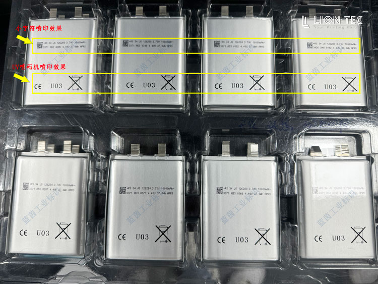 鋰電池行業(yè)客戶,原有的噴碼設(shè)備是小字符噴碼機(jī),打印字母數(shù)字還可以,但隨著行業(yè)規(guī)定的變化,電池上打印的內(nèi)容涉及到了二維碼和一些圖標(biāo),慢慢的發(fā)現(xiàn)原來的點(diǎn)陣式小字符噴碼機(jī)不能滿足二維碼、圖標(biāo)的高清晰、高識(shí)別率的需求,設(shè)備升級客戶得知了UV噴碼機(jī)與印刷體一致的打印性能后,找到了藍(lán)茵,并進(jìn)了打樣測試,以下是打樣效果。