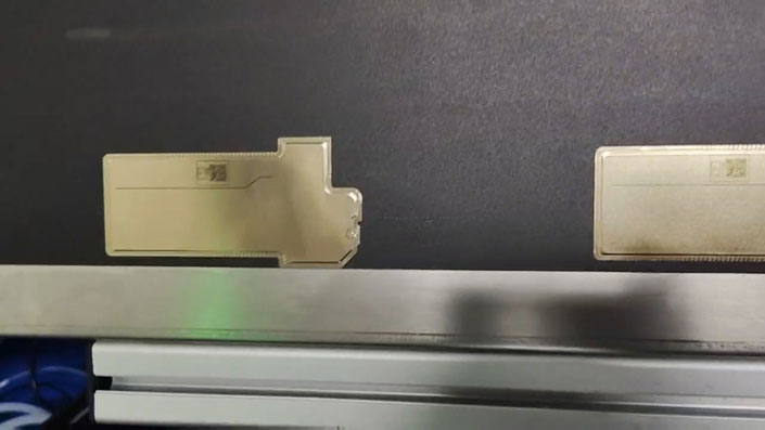 手機(jī)模組配件要在其玻璃材質(zhì)表面噴印二維碼、文本內(nèi)容,文本內(nèi)容與二維碼底色采用了白墨噴碼方式,二維碼采色黑墨,黑白對(duì)比,二維碼內(nèi)容更易識(shí)別。?對(duì)于光滑的玻璃表面,UV噴碼機(jī)噴印可以做到高附著力,高清晰,二維碼易識(shí)別的效果。