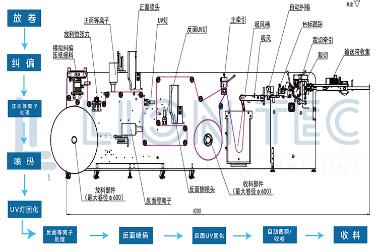 放卷 ? 自動(dòng)糾偏 ? 正面等離子 ? 正面UV噴碼固化 ? 反面等離子 ? 反面UV噴碼固化 ? 自動(dòng)裁切/收卷。材料只需穿機(jī)一次,設(shè)備通過(guò)精密的機(jī)械走帶與控制系統(tǒng),在同一條流水線上連續(xù)完成正反兩面的高精度賦碼。無(wú)需人工翻卷,產(chǎn)能直接翻倍。配合前端的“自動(dòng)糾偏系統(tǒng)”,即使在高速運(yùn)轉(zhuǎn)下,材料也絕不跑偏,確保正反面圖文對(duì)位精準(zhǔn)無(wú)誤。